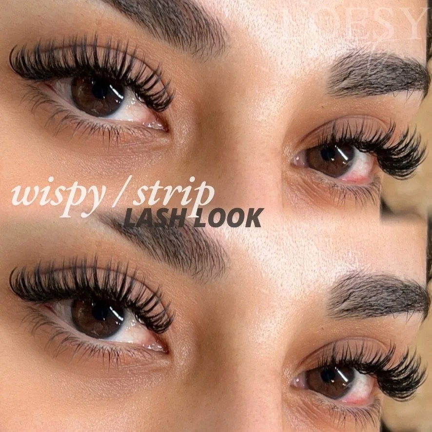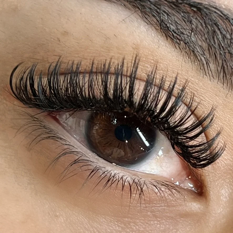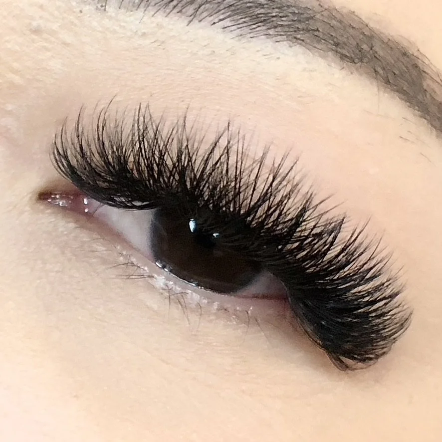 Wispy: A styled, fluffy look using different lengths and spikes to create a textured, “strip lash” effect. Can be done with Classic, Hybrid, or Volume fans.